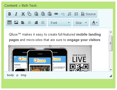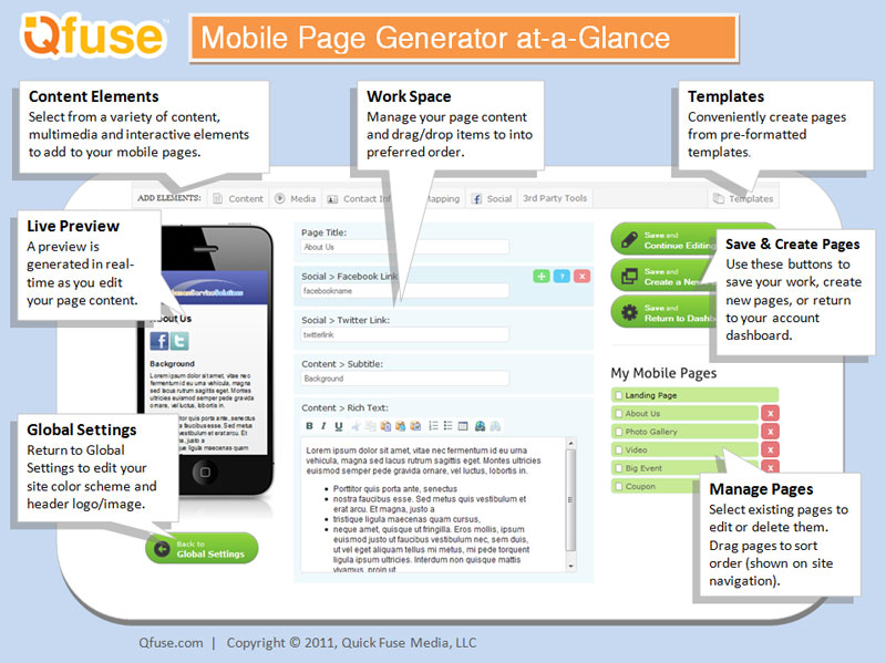 The Qfuse mobile website editor is an all-in-one interface for managing your mobile websites and editing individual mobile landing pages. It is effectively a Mobile Content Management System ("Mobile CMS").