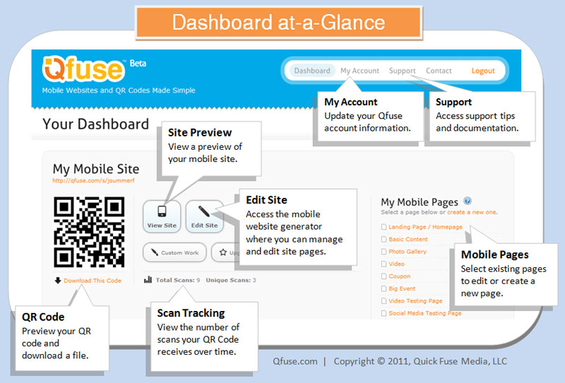The Qfuse Dashboard is a centralized area from which you can maintain and track your QR Codes and/or NFC Tags.