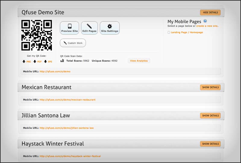 Qfuse makes it easy to manage, search, filter, and sort hundreds--or even thousands--of QR Codes and mobile landing pages. In one central QR Code Manager you can toggle between external URLs (like Facebook, YouTube, or your own mobile pages) and mobile landing pages created within Qfuse for your codes.